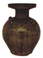 淺盤口,短徑,鼓腹下收。盤口外壁內束,口沿飾對稱褐色點彩四處,並刻弦紋兩道。肩部到弦紋三道,並在近頸部分二道弦紋上堆塑一裝飾性小雞頭,尖嘴無孔,相對一側三角形雞角。另外兩側貼有兩個條形豎繫。施青黃釉,不及黃釉,不及底。釉層輕薄,並開細碎紋片。