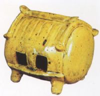 呈長鼓形,正面鏤兩個大小相同的方形孔及條状台面,是供雞出入之處。舍頂贴塑瓦檐,底置四個柱脚以隔潮瀑,反映了當地獨特的習俗。此器十分珍貴,較為少見。