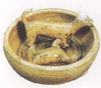 呈规整的圆钵形,内塑雨雙小狗,一雙侧身酣睡,另一雙翘尾、竖耳,雨眼盯視前方,似在精酣睡的小狗守衔,一動一静,形象生動。内外施青釉,呈炒米黄色。此器釉色,均佳,保存較好。