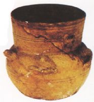敞口,直壁,圆腹,平底。頸及腹部厭弦叙七道,雙繫。腹部堆饰蛙的頭和四肢。蛙眼圆突,嘴宽大紧閉,四肢作划動莊。全器施青黄釉。因經修補,故定為二級品。