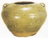 斂口,雙肩,無蓋,肩部塑雨繫。罐身施青釉,釉色光亮。肩、腹刻劃弦纹,兩繫饰藁胍紋。此罐造型規整, 給人以渾厚,古樸之感。因器腹破損修補,釉質不均。