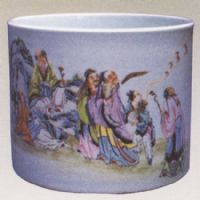 筆筒呈直筒形,玉璧形底足。胎質细腻潔白。釉面明润。粉彩繪製仙人圖,人物刻畫生動,色彩柔和孀媚,圖案疏密有致,充分體现了中國書“疏可跑馬,密不穿针”的怖局特點,底部青花書“雍正年製”四字款。
