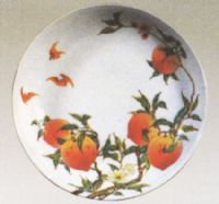 敞口,浅腹,圈足。粉彩繪桃枝及八個硕桃。胎體轻薄,胎釉细腻。外底青花楷書“大清雍正年製”六字款,圖案由盤外壁延伸到器内,成為一個整體。此器色澤嬌嫩柔雅,層次分明,紋飾清新淡雅,為雍正粉彩器的代表作。