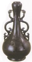 瓶口呈蒜頭狀,細長頭,圓腹,圈足。頸部飾對稱螭耳。此器造型俊秀,刻畫紋飾精美,胎白質堅,釉色呈鮮嫩的茄皮,釉面晶瑩光潤。具有重要的科學藝術價值。