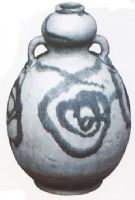 器呈葫葫蘆形。通體施灰色釉,上饰雲狀黑斑彩。花釉是唐代開創的一種獨具藝術魅力的釉裝飾,為宋代鈞窯窰變釉奠定了重要的工藝基礎,造型自然淡雅,渾圓飽滿,具有唐代的典型的特徵。此器製作規整,施釉均勻,釉彩艷麗,為唐代花釉瓷中的精品。