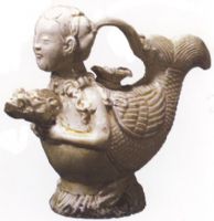 此器作人首魚身状,人首為少女頭像,手握龍頭形水流。器物造型構思獨特,展示了遼代陶工的豐富想像力和制造力,製作精巧,集堆贴、雕刻於i身,栩栩如生。