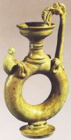 壺盤口,圓形管狀身,堆貼有雞首形流和龍形柄,胎質灰白。施青釉,釉色發黃,有細開片。此罐造型奇妙。製作精緻,反映了隋代青瓷中的精品,此壺傳世僅見兩件。十分珍貴。