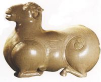羊作卧伏状,昂首张口,身体肥壮,器身饰有刻劃紋,通体饰青釉。此羊造型優美,形體較大,施釉勻凈,色澤淡雅,代表了三國時刻青瓷的發展水平。