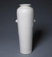 瓶身呈筒状,撇口,束颈,细长腹,圈足。腹部两侧置兽耳。通体施白釉。