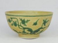 黄地绿彩是低温色釉釉上彩品种之一,以黄色釉为地,用绿色在锥刻好的暗纹上施以彩绘。这种装饰方法在盘、碗上较为常见。