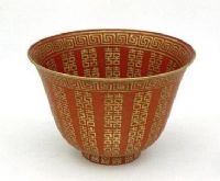 碗撇口,深腹,圈足。通体红釉描金。口沿内外及腹部近足处饰描金回纹,内外壁和足墙饰描金彩“囍”字,内底心描金团寿字纹。足底书矾红彩“燕喜同和”四字楷书款。