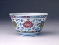此碗在施彩技法方面独具特色,即外壁六朵花均循青花轮廓线再勾描金彩,金彩的使用协调了各种彩料之间的关系,避免了不同色彩之间的对比过于强烈,使画面显得柔和悦目。