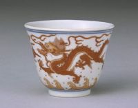 此盅仿清康熙器形烧制,曲线流畅,器形优美,所绘云龙线条一丝不苟,为一件清代后期官窑制作的精美的酒具。