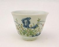 这种造型与纹样的小杯是对康熙十二月杯简化的结果,是乾隆朝不再生产十二月杯以后的一种替代品,从嘉庆朝到宣统朝都有烧造,其造型、纹饰大体一样。由于其纹样多为兰花、山石,故也称斗彩兰石酒杯(或盅)。