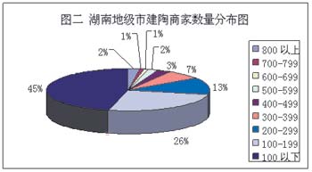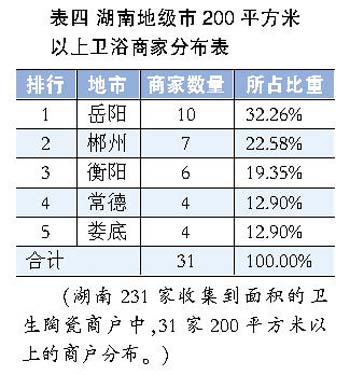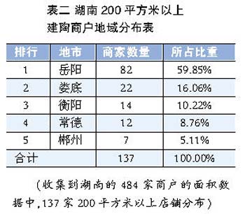 据《兴邦陶瓷》各地记者的调查数据来看,在湖南岳阳、娄底、衡阳、常德、郴州5个地级市市场的484家建陶店中,200平方米以上(含)商家有137家,占比为28.3%,面积占比却超过71.29%,商家经营面积呈扩大之势。137家200平方米商家的区域分布,主要集中在岳阳、娄底。其中仅岳阳就占了59.85%的份额,娄底占16.06%。