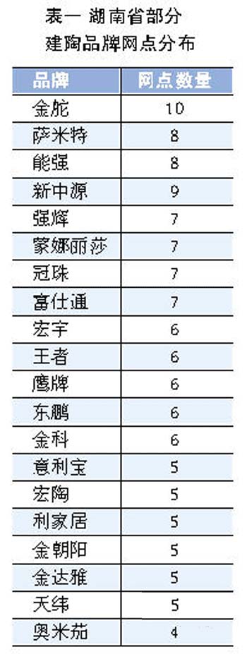 从品牌网点分布来看,金舵以10个网点的数量在湖南地级市中处于第一位,萨米特、能强、新中源、强辉尾随其后。位于前20位的,除了岳阳所产的金达雅品牌外,其余都是广东品牌。