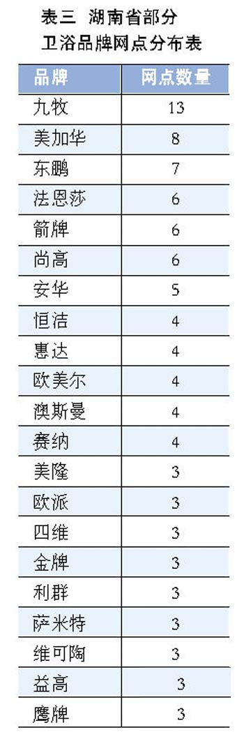 在湖南的卫浴品牌网点分布上,九牧在与箭牌、惠达、美加华、法恩莎、恒洁等国内知名品牌的角逐中居于领先地位。九牧是最早把产品摆在县乡市场的五金店中销售的品牌,甚至都没有划出专区,后来才逐渐划出专卖区、开专卖店的,因此不难理解它在卫浴品牌的网点数量上,在全国范围内始终居于前列。据悉,目前九牧在全国的网点数量达到了200万个。九牧这种从三四级市场向一二级市场迈进的“农村包围城市”的战略,通过数量众多的网点,带来巨大的销量和丰厚的利润。相比之下,很多陶瓷企业寄希望于几个大店带来丰厚利润的做法显然值得商榷。近年来,九牧也开始在中心城市建设一些有规模的专卖店,但单店效益明显的小店模式仍是九牧的终端主流。