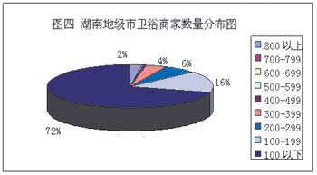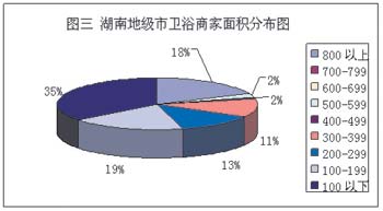从湖南卫浴商家数量/面积分布图可以看出,湖南卫浴商家200平方米以下店面数量占比为54.05%,其中100平方米以下(含)商家数量占比达35.54%,这说明湖南地级市卫浴商家以小面积为主。但800平方米以上(含)大店虽然数量占比只有2.27%,但面积占比却达到18.45%,与100-200平方米店面面积占比18.51%几乎一致。
