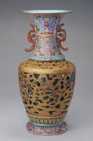 瓶撇口,长颈,折肩,圈足外撇。颈上对称置红釉描金螭龙耳。内壁施松石绿釉。瓶颈以紫地粉彩装饰,绘缠枝花卉纹。瓶腹饰金彩,镂空雕暗八仙纹。内瓶可以转动,以粉彩绘八仙人物纹。无款。