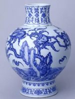 此瓶造型构思奇巧,青花浓重艳丽并有晕散,具有仿明代永、宣青花的艺术效果。纹饰为吉祥图案,寓意“寿山福海”。
