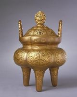 炉仿铜质香炉的式样,嵌入式炉盖,直口,束颈,冲天绳耳,扁圆腹,下承三柱状足。口沿处印阳文“大清乾隆年制”六字横排篆书款。通体施金彩,饰模印和镂空花纹。盖面均分为6瓣,每瓣圆形开光内镂雕双螭纹,开光上方模印变形龙纹一周,盖钮为镂空莲花荷叶纹。炉颈部与炉身三个桃形开光内凸印蟠螭纹,腿部凸印变形蝉纹。
