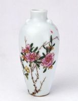 此瓶在似绢般的釉面上作画,设色淡雅,构图简洁清新,有雍正珐琅彩之遗风。