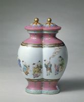 瓶呈双连式,洗口,溜肩,肩以下收敛,近足处微外撇。瓶附双联盖,盖钮涂金彩,盖面用蓝、红、黄彩描绘垂叶纹。口、足均以淡绿彩描绘折枝菊纹。肩、圈足外墙皆以胭脂红地璎珞纹、磬纹装饰。腹部绘主题纹饰婴戏图,一面为四婴、三羊,寓意“三阳开泰”;另一面为九子嬉戏,其中一小童怀抱宝瓶,瓶中飞出五只红色蝙蝠,寓意“福在眼前”。外底署青花篆书“大清乾隆年制”六字横款。