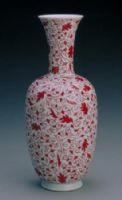瓶撇口,细长颈,丰肩,肩以下渐收,圈足。通体在白釉地上用矾红彩描绘缠枝甘藤纹。圈足内施白釉。外底署青花楷书“大清雍正年制”双行六字款,外围青花双线圈。