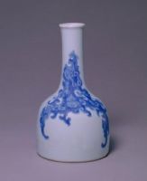 尊圆口,长直颈,溜肩,直腹,圈足。内施白釉。外壁青花装饰。瓶体通过留白的装饰技法,颈、腹间绘有青花夔凤纹样。圈足内施白釉。外底署青花楷书“大清雍正年制” 双行六字款,外围青花双线圈。