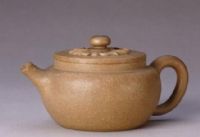 壶阔口,圆肩,扁腹,短直流,粗环柄。盖面突起浮雕的柿蒂纹。浅赭色调砂泥,布满白砂点,砂泥颗粒较粗,但粗而不涩。