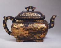 以漆髹饰紫砂壶始于明代,清雍正年间吸收了漆画中重彩描金的技法,将壶体装饰得金碧辉煌。