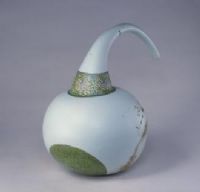 壶小口,曲长颈,口至颈渐粗,球形腹。因形如圆茄,故俗称“茄式壶”。通体施白釉。颈之近肩处以黄、绿、墨3种色彩绘卷枝纹装饰带。腹下部绘绿彩绣球花纹一组。无款识。