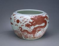 钵缸圆口内敛,鼓腹,圈足。内外施白釉。外壁釉里红装饰。以釉里红描绘海水江崖双龙戏珠图案,龙睛以青花点饰,双龙从海水中腾起,威武矫健,作戏珠状。近口沿处绘青花弦线两道。