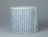 笔筒呈圆桶形,直壁,口足尺寸相若,玉璧形底足。内外施白釉,外壁的主题图案为青花楷书《圣主得贤臣颂》一篇。文章的结尾用书写的形式钤釉里红“康熙传古”篆体印。文字笔画工整,娟秀清晰。底心施白釉,署青花楷书“大清康熙年制” 三行六字款。