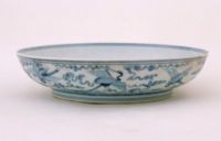 盘口微撇,弧腹,圈足。盘内外青花装饰。盘内饰桃树一棵,结9枚硕桃。外壁绘8只飞鹤,间以带状云纹,近底处为海水江涯纹。外底双圈内署“大清雍正年制”六字楷书款。