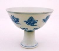 这件高足盅是仿明成化款的同类器,其青花色调浅淡,图案轻描淡绘,线条纤细清晰,釉面乳白莹润,是仿明成化青花八宝高足盅的成功之作。