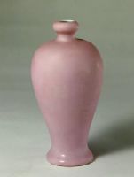 瓶口内敛,口形如蒜头,短颈,丰肩,肩以下渐敛,圈足微外撇。通体施淡粉色釉,属低温金红釉。瓶里及底均施白釉。底青花双圈内楷书“大清雍正年制”六字款。