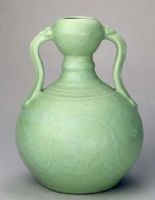 瓶蒜头口,颈部上细下粗,腹硕圆,圈足,口、肩部连以如意形双耳。瓶内及足内施白釉。外部通体施绿釉,绿中带黄,淡雅宜人,称“秋葵绿釉”。口及腹部均有暗刻缠枝莲纹,肩部凸起弦纹3道,弦纹下饰如意头纹一周。足内青花篆书“大清雍正年制”六字款。