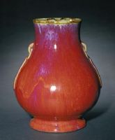 此瓶釉色鲜艳浓重,宛如燃烧的火焰般灿烂夺目,为窑变釉中“火焰红”的典型作品。瓶的口沿处和耳部因釉层流动变薄而形成的灯草边是雍正时期窑变釉类瓷器的特征之一。
