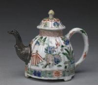 壶体瓜棱状,直口,有盖,金属流,壶底有三足。壶身以五彩绘瑞兽麒麟,伴以花石园景,色彩艳丽,构图饱满,造型十分独特。