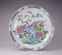 此盘的装饰风格接近清康熙时期的粉彩瓷器,尤其是口沿处的一周锦地开光和图案充满盘心的装饰方法在康熙时期的粉彩器物中很常见,由此推断这件器物应是雍正早期的作品。在装饰上运用雉鸡、牡丹、洞石等,寓意“吉祥富贵”和“长寿富贵”,这种借物寓意的装饰手法在清代瓷器上很流行。此盘构图严谨,运笔流畅,雉鸡的形象栩栩如生,盛开的牡丹花和用蓝料彩描绘的太湖石使画面平添了几分生机。