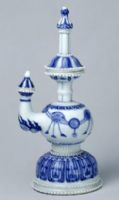 此壶造型仿藏族银制贲巴壶烧造而成,制作精巧,新颖别致,青花发色浓艳。纹饰具有浓厚的少数民族艺术风格,为瓷器中的精品。