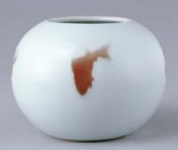 丞敛口,圆腹,卧足,形似钵。内外施青白釉,足沿无釉。外壁饰釉里红游鱼,姿态各异。外底心有青花楷书“大明宣德年制”双行六字款。