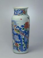 此瓶造型古朴厚重,施彩丰富,具有中国传统花鸟画的特色。此种瓶式是清顺治、康熙时最为流行的器形。