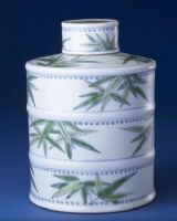 罐小口,直颈,斜平肩,圈足,带盖。罐身以凸弦纹为界分成三段竹节式。器盖亦竹节形,上、下缘凸鼓,盖顶以覆彩技法绘团菊纹,黄蕊红瓣。器盖及罐身竹节处均以连珠纹装饰成竹根点斑,通体绘多组竹叶纹,竹叶填绿色淡彩。底双圈内书青花“大清康熙年制”双行六字楷书款。