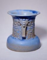 花囊撇口,粗长颈,短腹,圈足。颈部凸雕饕餮纹,颈两侧置对称兽头长鼻耳。紫砂胎,外罩乳浊的天青釉,釉汁肥厚。