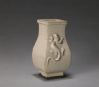 瓶呈四方体形,唇口,直颈,腹部略鼓,腹下渐收,方圈足。通体施釉,釉色光润而细腻,釉面有细碎开片纹,足露黑胎。瓶身两侧各饰一凸螭虎纹,显得颇有气势。无款识。