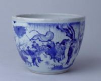 此缸描绘的故事出自《三国演义》中的《馈宝说吕布》一节,李肃受董卓之命,带着赤兔宝马、黄金、珠宝、玉带等宝物来到洛阳城下的吕布军帐中,说服吕布投降。匠师巧妙地将此故事情节移植到器物的装饰画中,人物形象生动,青花色泽浓艳,为崇祯朝青花瓷器中的上乘之作。