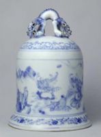 明天启朝历时仅7年,传世品数量极少,此件带有明确纪年款的青花钟实属罕见珍品。此钟形制系模仿周代青铜打击乐器中的青铜钟。其造型秀丽,线条圆滑流畅,龙头钮设计巧妙,使精巧的瓷钟平添几分庄重气派。钟体洁白莹润的釉面上,以工整细腻的淡描青花描绘十八罗汉图,画中人物或卧或立,各持法器,各显神通,形象鲜明生动。此钟在天启青花大多画意粗率的器物中堪称精美之作。