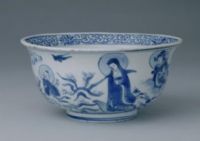 此碗青花设色清新淡雅,富有层次,人物形象准确生动。最为珍贵的是署有纪年款,万历四十四年即1616年。以往认为清代康熙时始有斜削式细砂玉璧底,此碗证明明代万历时已开先河。